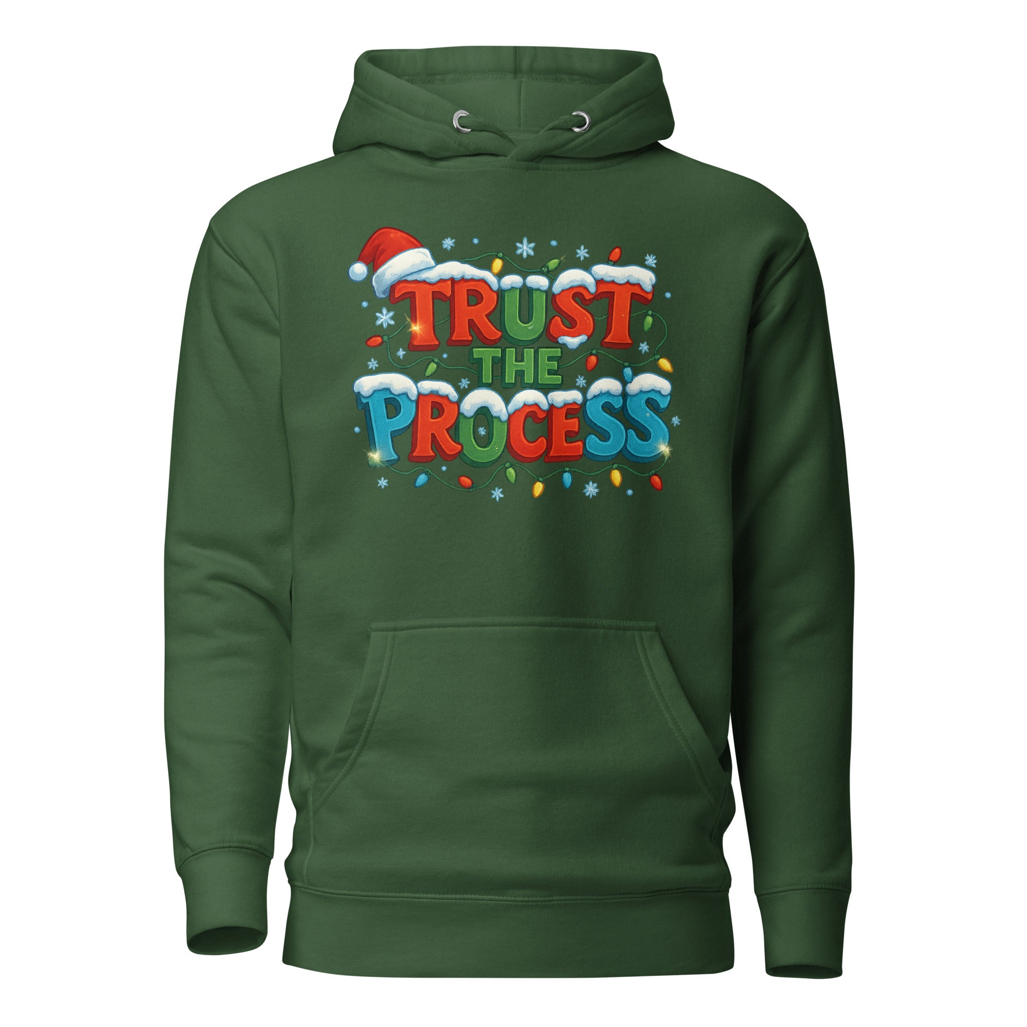 Celebrate the season with purpose and style in the Trust The Process Holiday Hoodie – Evergreen Edition. This festive green hoodie blends motivation and holiday cheer with a bold “Trust The Process” design wrapped in snow, glowing lights, and a Santa hat topper. The mix of red, green, and frosty blue lettering gives it that perfect Christmas energy — joyful, cozy, and full of meaning.