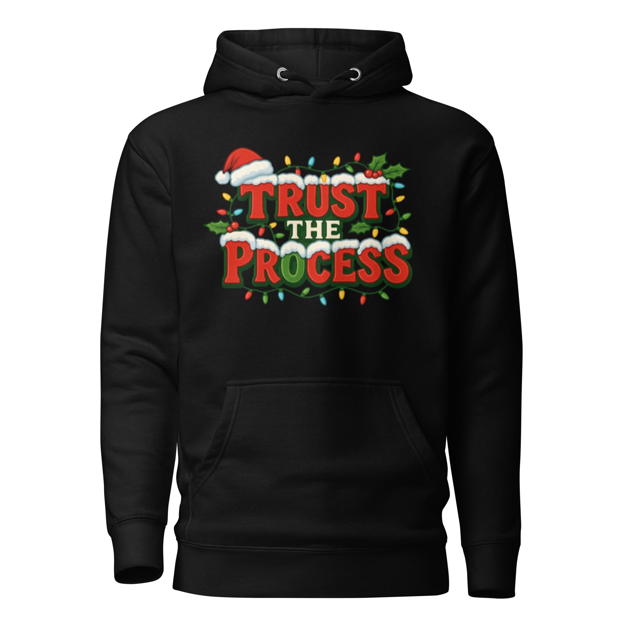 Stay festive and focused this season with the Trust The Process Holiday Hoodie – Classic Black Edition. This cozy hoodie brings together Christmas cheer and everyday motivation, featuring a bold red and green “Trust The Process” graphic wrapped in twinkling holiday lights, holly leaves, and a Santa hat accent. The black base makes the design pop, giving you a perfect mix of seasonal spirit and timeless streetwear style.
