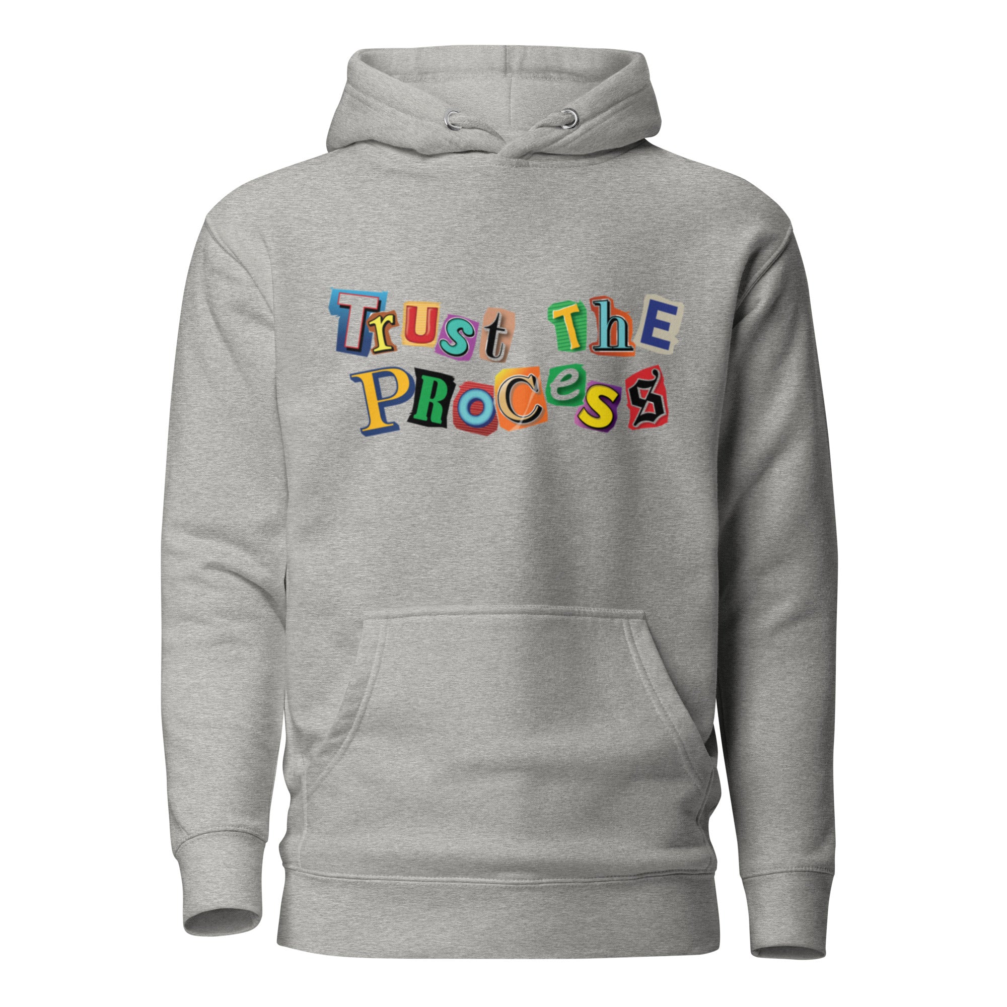 •Color: Heather grey hoodie with multicolor “Trust The Process” cut-and-paste design