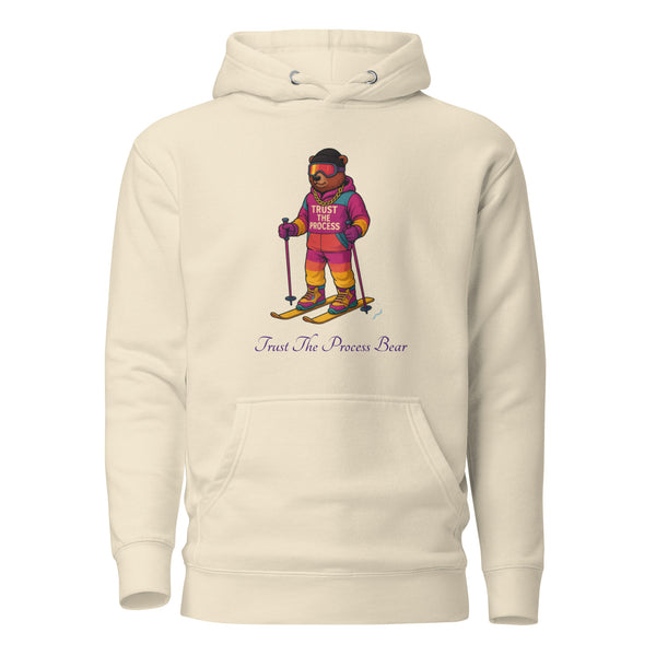 Printed on a soft cream fleece hoodie, the artwork stands out with smooth shading, crisp detail, and a stylish modern look. The Bear stands confidently atop fresh powder, with “Trust The Process” displayed across the chest to remind you to stay grounded, steady, and focused — on and off the slopes. The script “Trust The Process Bear” adds a refined finishing touch beneath the graphic.