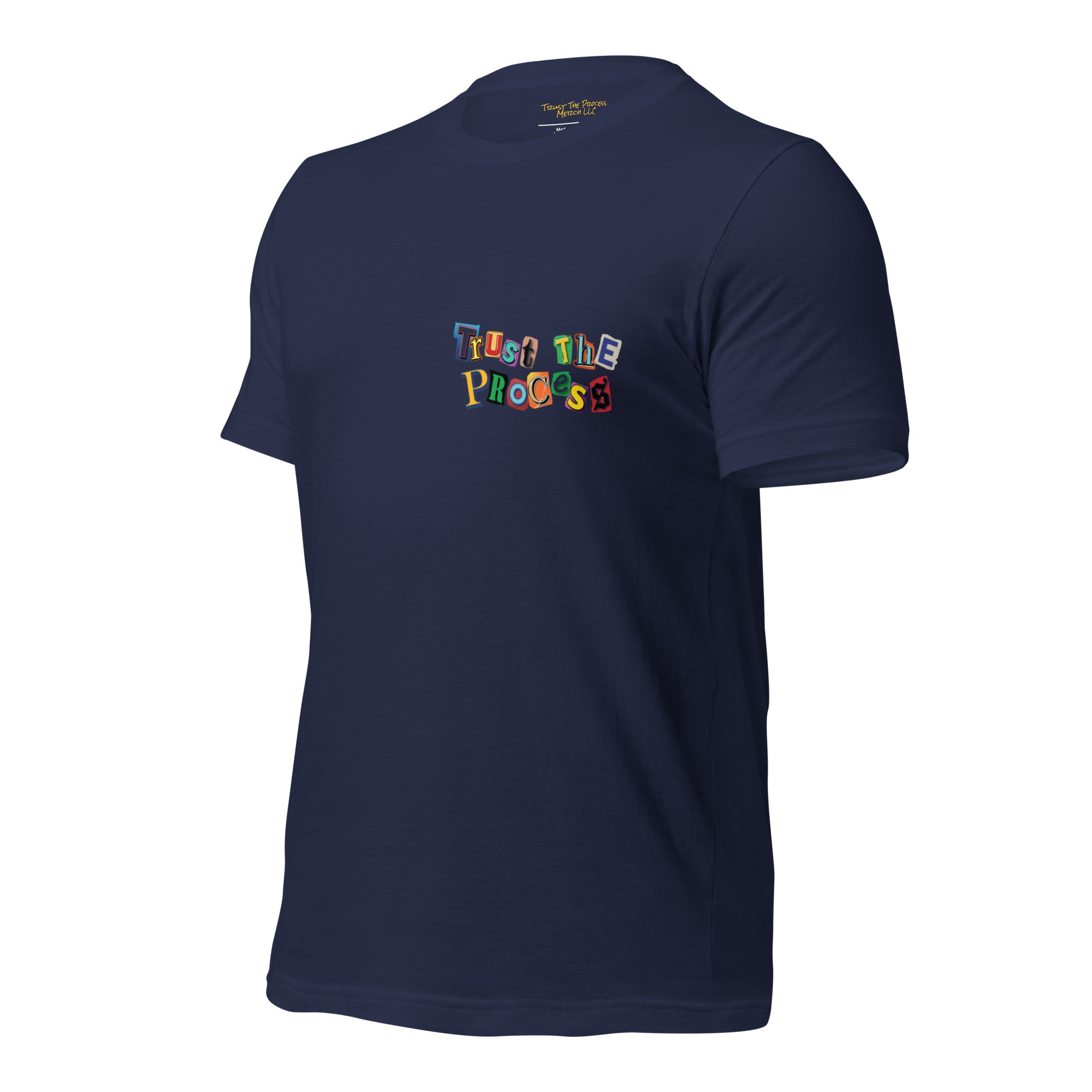 •Color: Navy blue tee with multicolor “Trust The Process” collage lettering