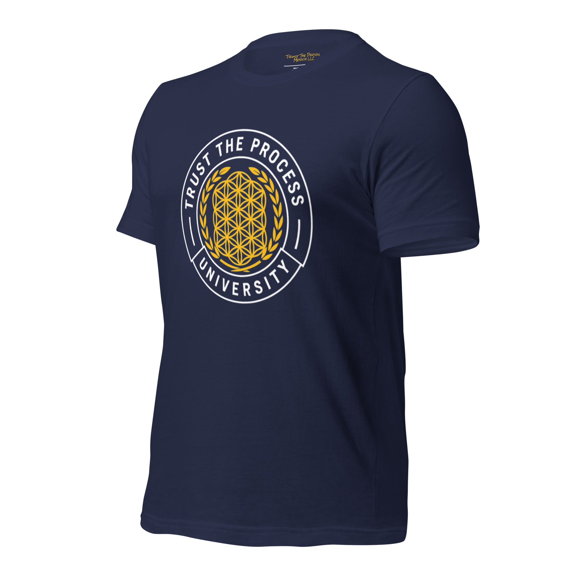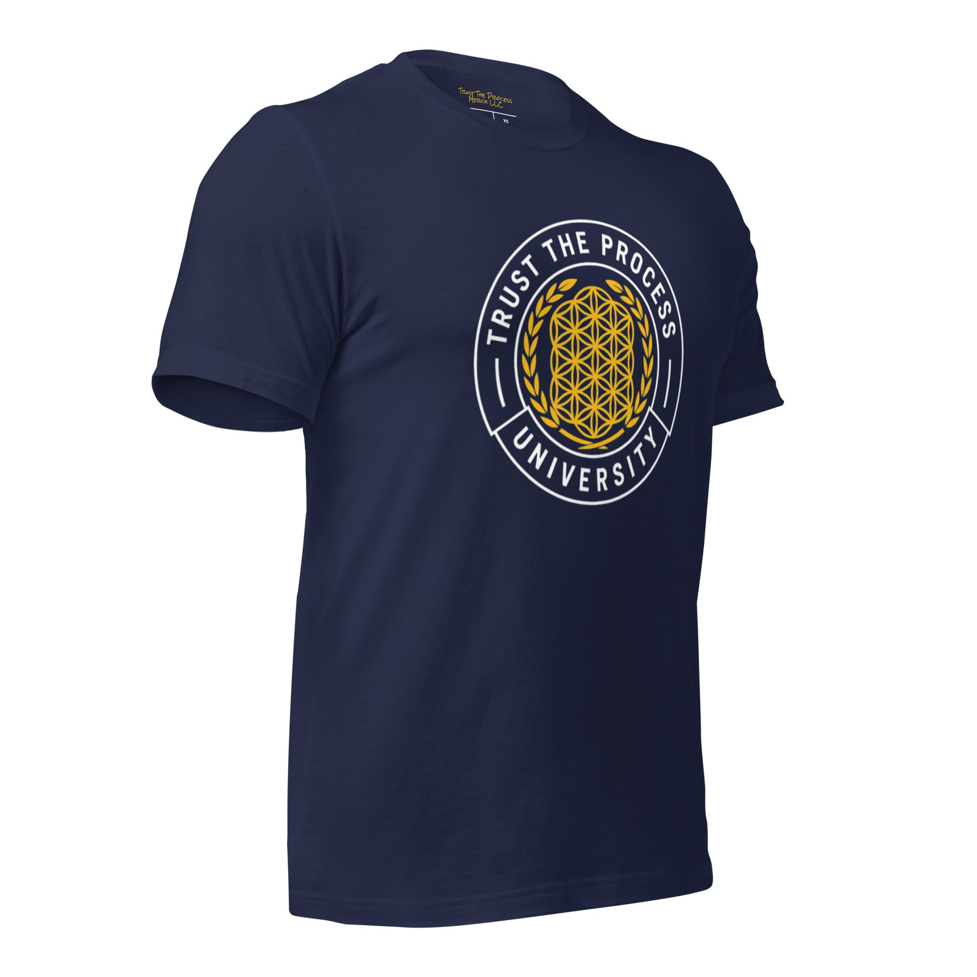 •Color: Navy blue tee with gold and white “Trust The Process University” Flower of Life design