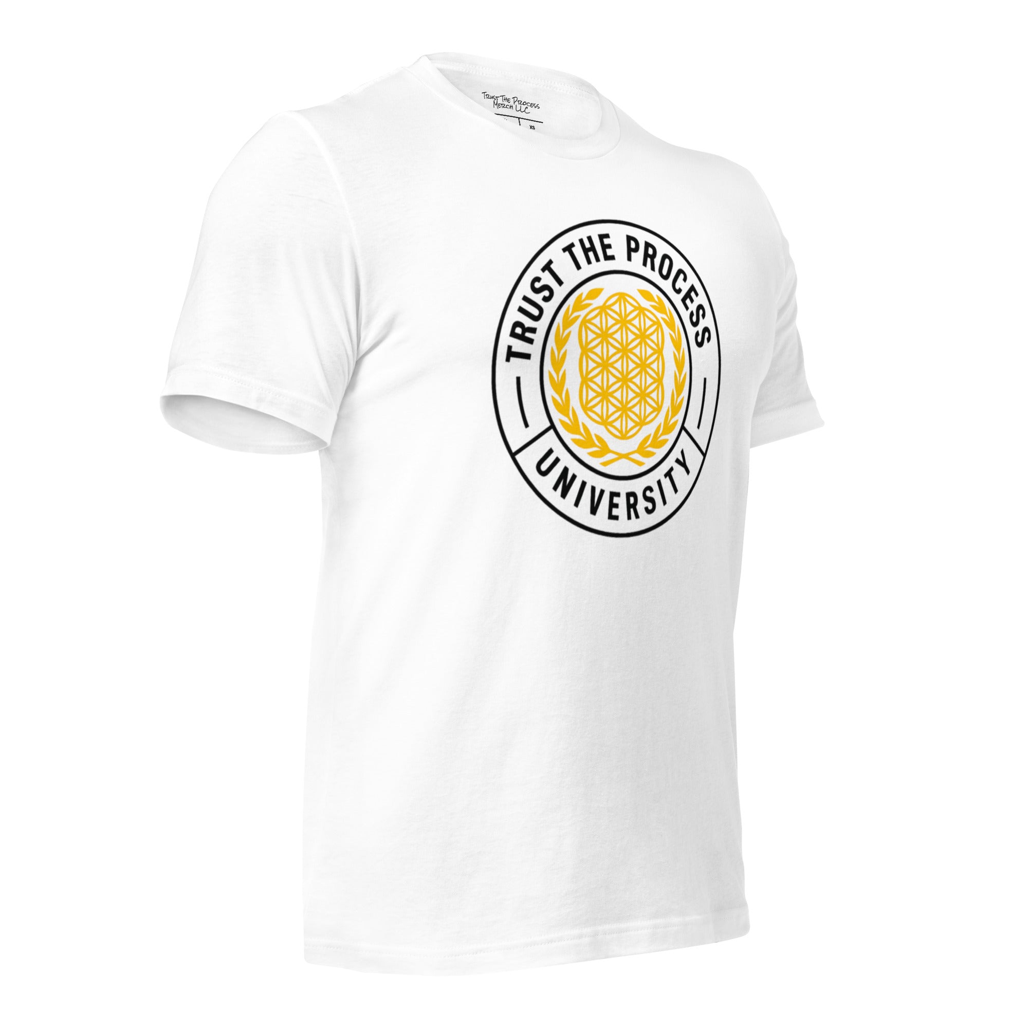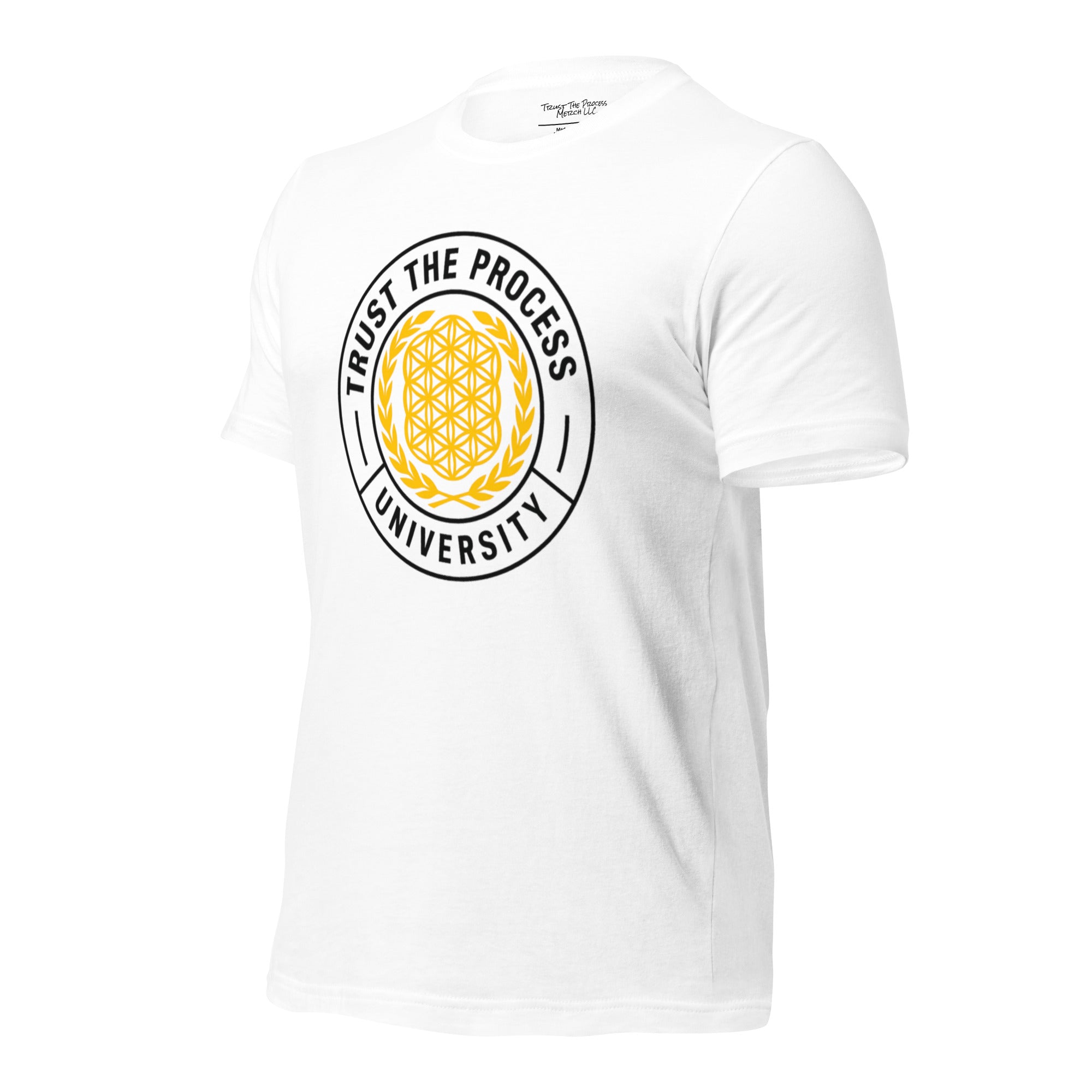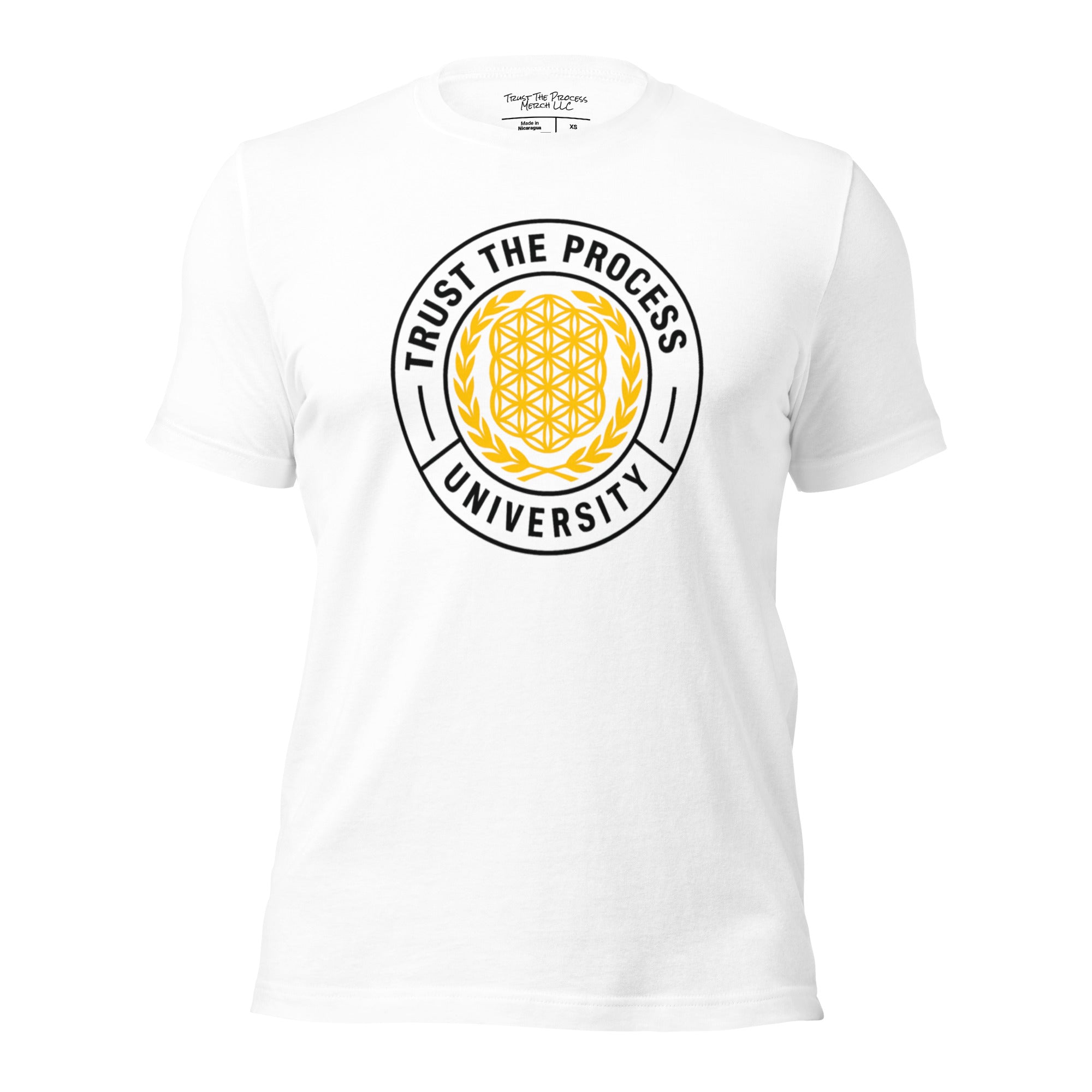 •Color: White tee with black and gold “Trust The Process University” Flower of Life design