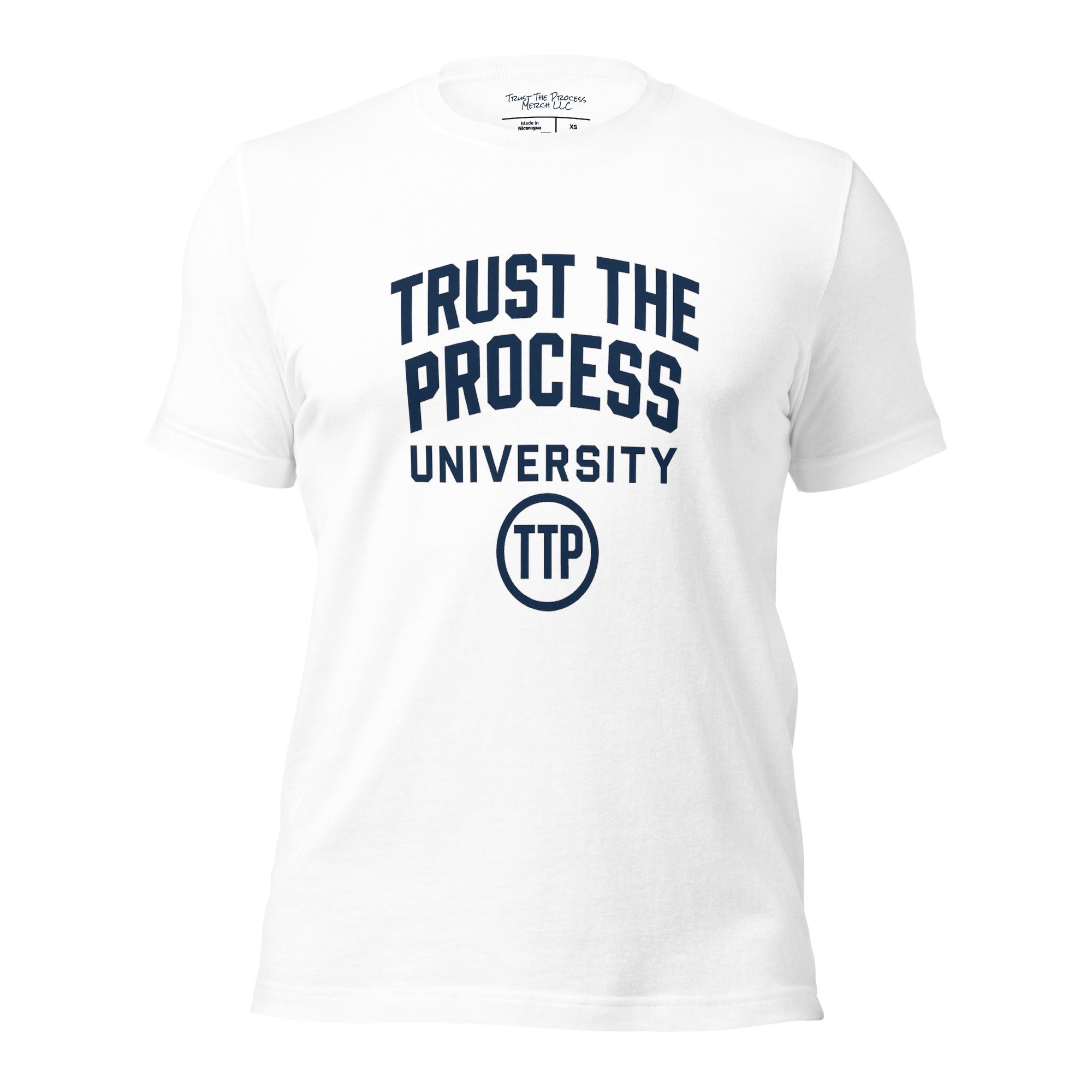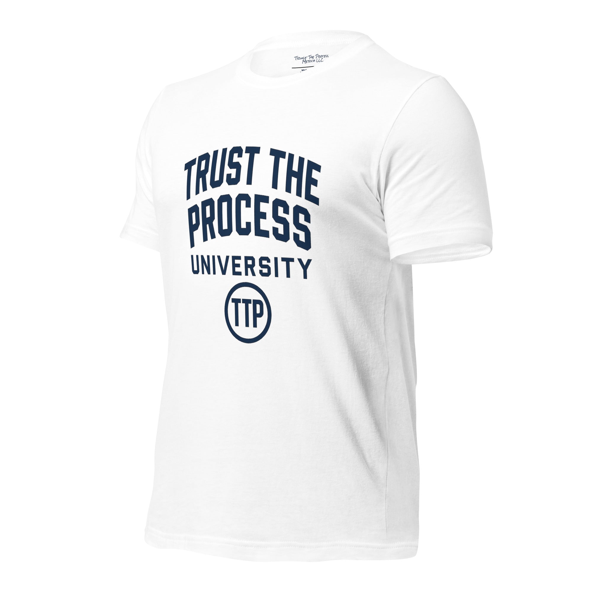 •Color: White tee with navy blue “Trust The Process University” lettering